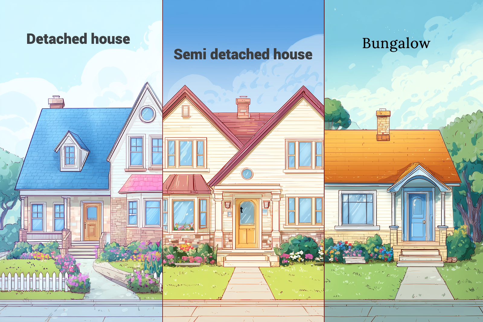 - Detached house | בית פרטי בודד – בית שעומד לבדו על מגרש אחד, ללא קירות משותפים עם בתים שכנים. זה יכול להיות בית עם קומה אחת בלבד או מספר קומות, לצד גינה ועליית גג או מרתף.