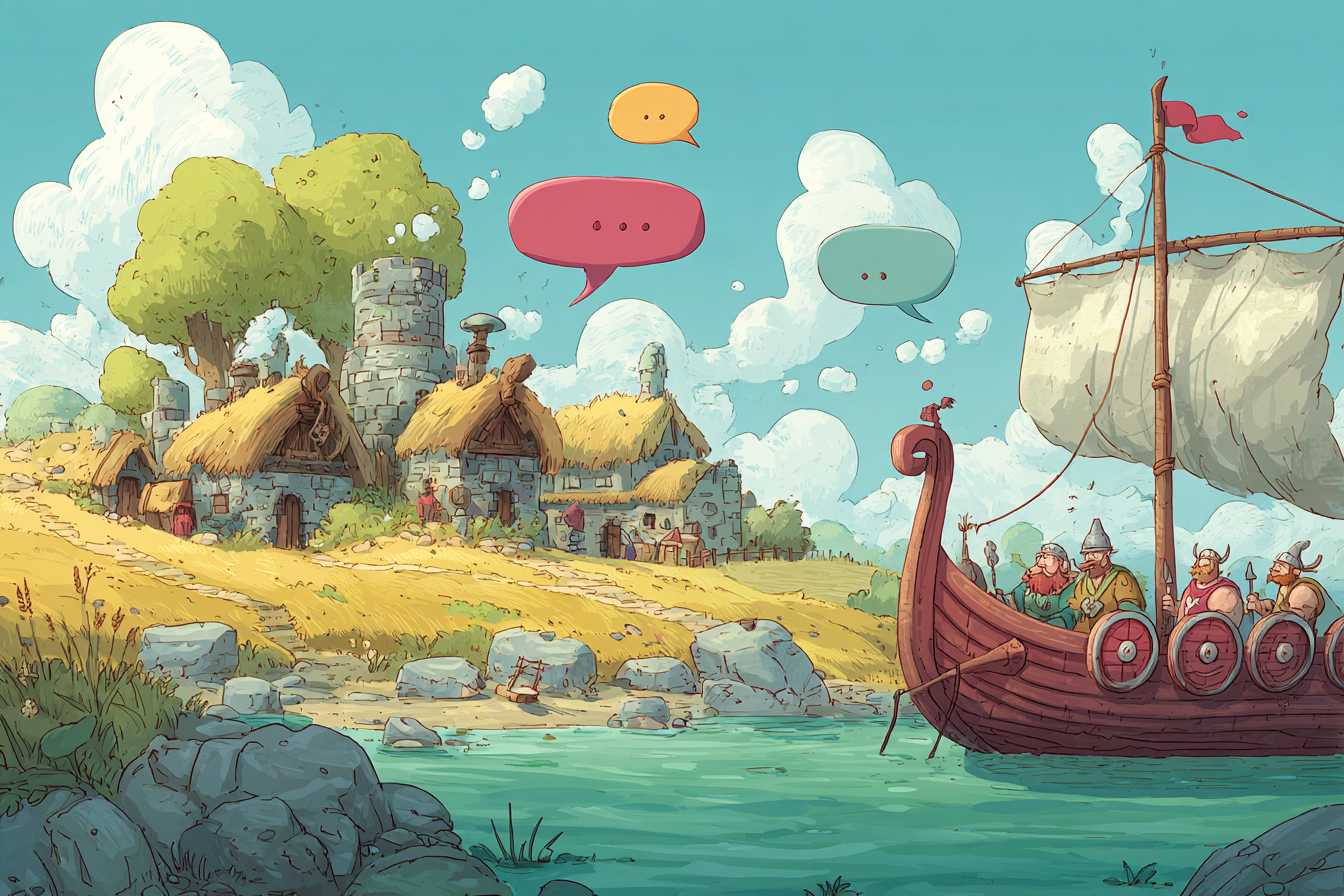 בסביבות שנת 800 לספירה, הגיעו פולשים חדשים בסירות ארוכות – הויקינגים ממדינות סקנדינביה (נורבגיה ודנמרק). הם התיישבו באנגליה ודיברו בשפה משלהם (נורדית עתיקה). במקום להילחם כל הזמן, הם התחילו לחיות יחד עם האנגלו-סקסונים, והשפות התערבבו. הויקינגים תרמו לשפה האנגלית מילים חזקות ושימושיות, כמו: